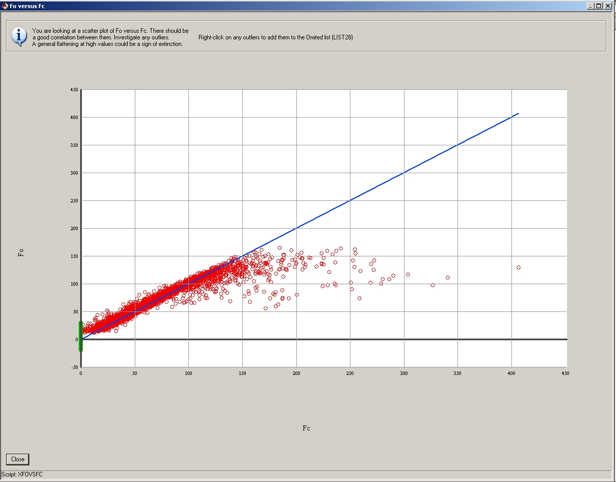 J'ai une structure qui tient absolument la route, pas d'indications de maclage, qui s'affine à RF=10% (I>2s(I)) et qui a un graph Fo versus Fc du type :