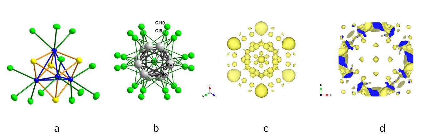 Un clathrate à base de clusters métalliques : des unités de construction inorganiques de type Mo4Si4Cla12 (i=inner, a=apical) [figure a] contenant des clusters métalliques de molybdène Mo4 peuvent s'assembler pour former un réseau inorganique géant structuralement proche d'un clathrate de type II. Ce composé est le premier membre d'une famille prometteuse de matériaux présentant une large gamme de propriétés physiques et qui combinent la chimie des clusters métalliques caractérisés par des électrons délocalisés à celle des clathrates inorganiques. D'un point de vue structural, ce nouveau composé de volume de maille proche de 80000 Å3 a été caractérisé par diffraction des rayons X sur monocristal : les techniques classiques de résolution structurale ont ainsi permis de mettre en évidence la présence de 136 entités Mo4Si4Cla12/2 reliées par des ponts chlore et formant deux types de pores géants, dodécaédriques (I) et hexacaïdécaédriques (II), dans lesquels sont insérés des clusters Mo6Cl14, des atomes de césium et des atomes de chlore qui tous occupent partiellement leurs positions cristallographiques. Les positions de ces atomes désordonnés dans ces deux types de pores ont été précisées par Maximum d'Entropie [figures b, c et d].